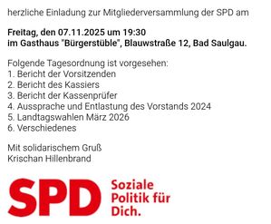 07.11.2025, 19:30 Uhr - 22:00 Uhr Mitgliederversammlung SPD Ortsverein Bad Saulgau